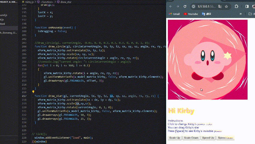 This project aims to draw, translate, rotate and animate Shapes created focus on Webgl. I use shaders to draw the complex character Kirby and create Kirby’s magic power. I make animation functions and also use the requestAnimationFrame tool to make the animations.